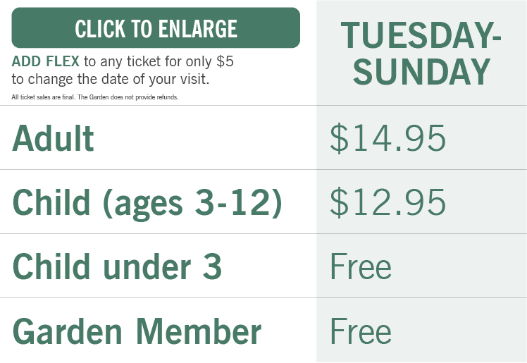 FLEX Tickets allow you to change the date of your visit due to weather or other unforeseen circumstances. It can be purchased with General Admission tickets. Contact the Garden for an easy exchange to a different day.